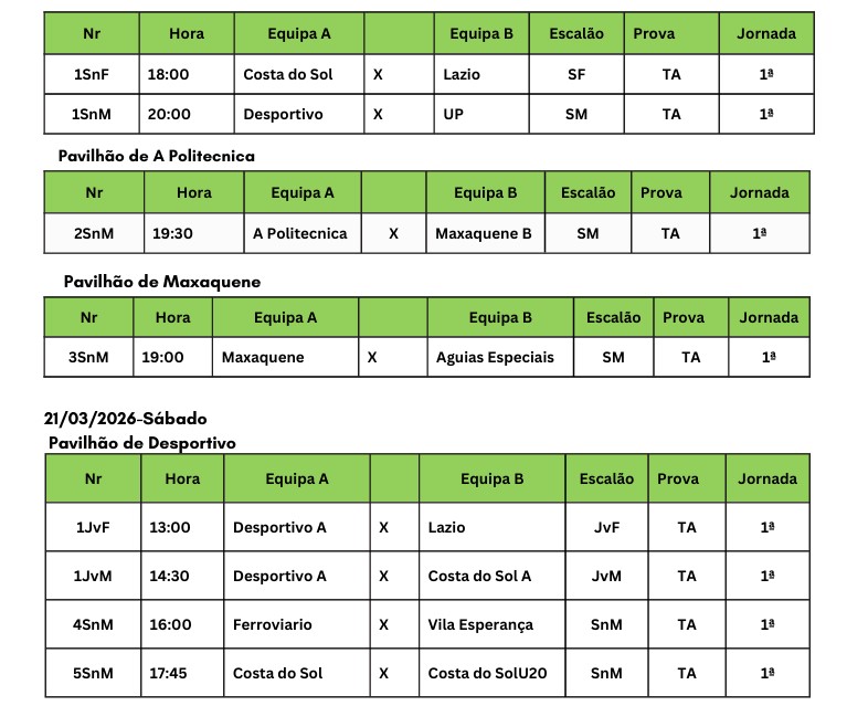 Os jogos serão disputados em juniores e seniores femininos e masculinos como o habitual. Logo na primeira jornada o Costa do Sol vai medir forças com o Lazio em seniores femininos na sexta-feira (19), o Desportivo de Maputo terá pela frente a Universidade Pedagógica em seniores masculinos.