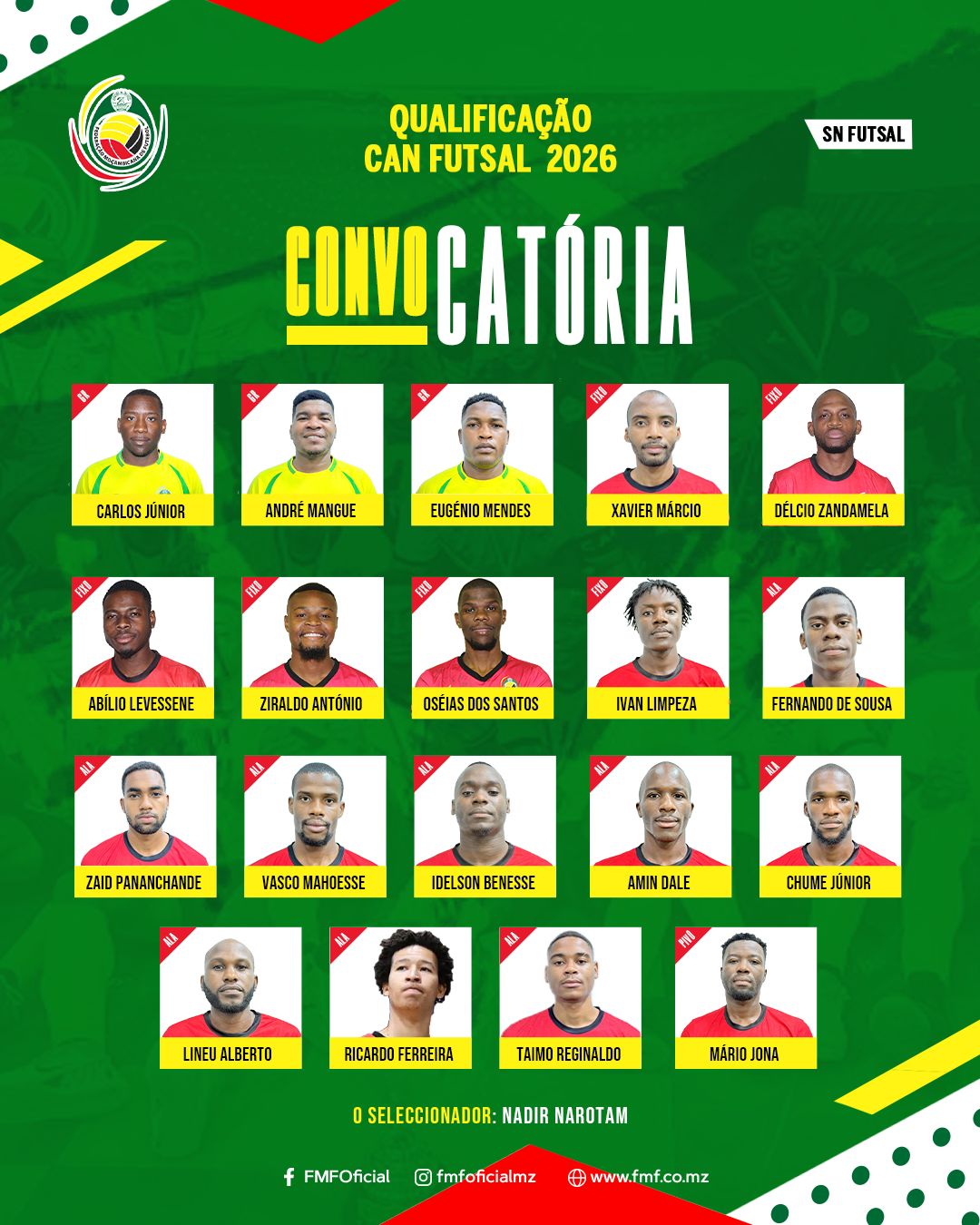 A selecção nacional de futsal já tem definida a lista de atletas convocados para os jogos de qualificação ao Campeonato Africano das Nações (CAN) de Futsal (2026). A convocatória foi tornada pública pela Federação Moçambicana de Futebol (FMF) e está sob responsabilidade do selecionador nacional, Nadir Narotam.
