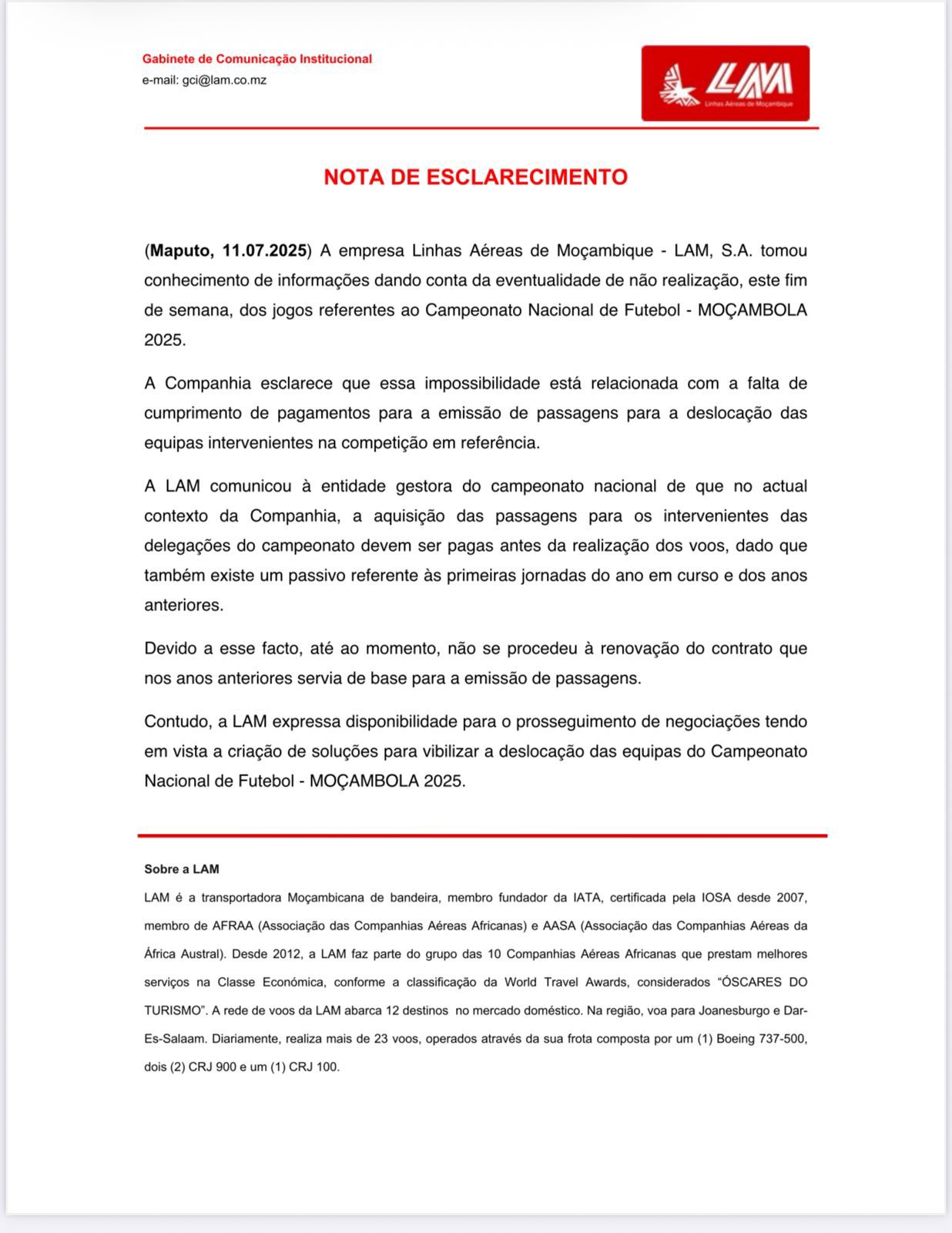 A empresa Linhas Aéreas de Moçambique(LAM), reagiu, através de uma nota de esclarecimento, ao adiamento de seis jogos referentes a sexta jornada do Moçambola 2025. Segundo à LAM, a adiamento para datas a anunciar deve-se ao não cumprimento de pagamentos para emissão de passagens por parte da Liga Moçambicana de Futebol(LMF).